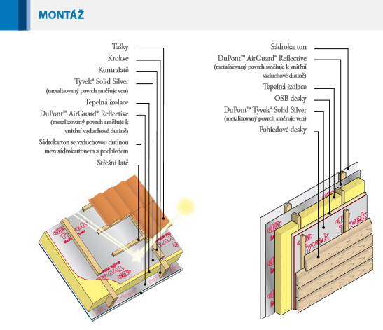 Použijte také kvalitní pásky od firmy DuPont k utěsnění přesahů podstřešní fólie a napojení na okolní konstrukce.Tím zamezíte úniku tepla prouděním a zvýšíte tak účinnost tepelné izolace.